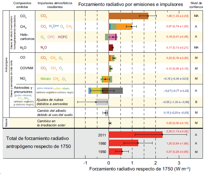 El forzamiento radiativo total es positivo y ha dado lugar a la absorción de energía por el sistema climático. La principal contribución al forzamiento radiativo total proviene del aumento en la concentración de dióxido de carbono en la atmósfera que se viene produciendo desde 1750.